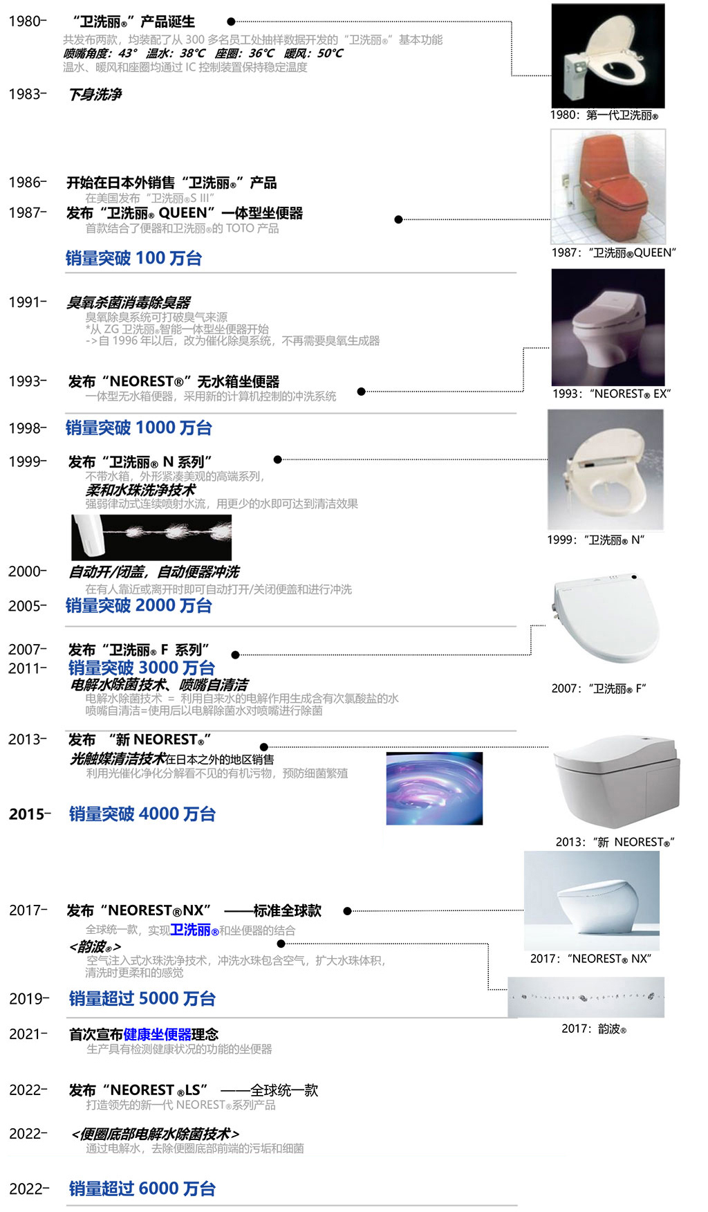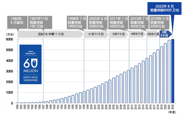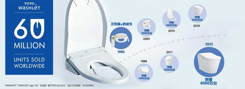 截至2022年8月,TOTO 衛(wèi)洗麗?產(chǎn)品全球銷量突破6000萬(wàn)臺(tái)。自1980年誕生以來(lái),歷經(jīng)40多年來(lái)不斷的創(chuàng)新與發(fā)展,衛(wèi)洗麗? 產(chǎn)品將清潔、健康的水洗文化傳遞至全球,改變了人們的如廁理念,帶來(lái)全新的如廁文化。
