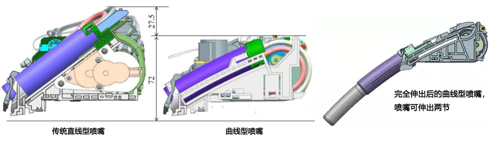 開(kāi)發(fā)“曲線型噴嘴”,需要設(shè)計(jì)人員從根本上更改之前構(gòu)成噴嘴零件所用的模具,并且克服一系列設(shè)計(jì)上的挑戰(zhàn),如縮小電機(jī),創(chuàng)新可伸縮的支架部件等。