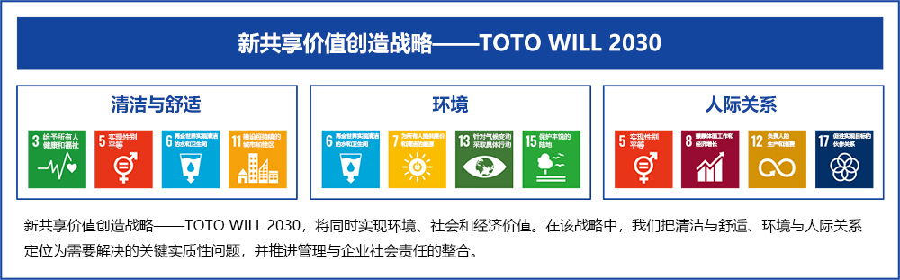 在2021年4月公布的新共享價值創(chuàng)造戰(zhàn)略--TOTO WILL2030中,TOTO集團將把清潔與舒適、環(huán)境與人際關(guān)系定位為需要解決的關(guān)鍵實質(zhì)性問題,并推進(jìn)管理與企業(yè)社會責(zé)任的整合。此外,新戰(zhàn)略還確立了“可持續(xù)產(chǎn)品”,即兼顧清潔、舒適和保護(hù)環(huán)境的獨特衛(wèi)浴產(chǎn)品系列,TOTO將努力擴大這些產(chǎn)品的使用范圍,為發(fā)展有利于環(huán)境的豐富舒適的社會竭盡全力。TOTO還將通過其商業(yè)活動努力解決社會問題來實現(xiàn)經(jīng)濟增長,并為實現(xiàn)聯(lián)合國可持續(xù)發(fā)展目標(biāo)(SDGs)竭盡全力。