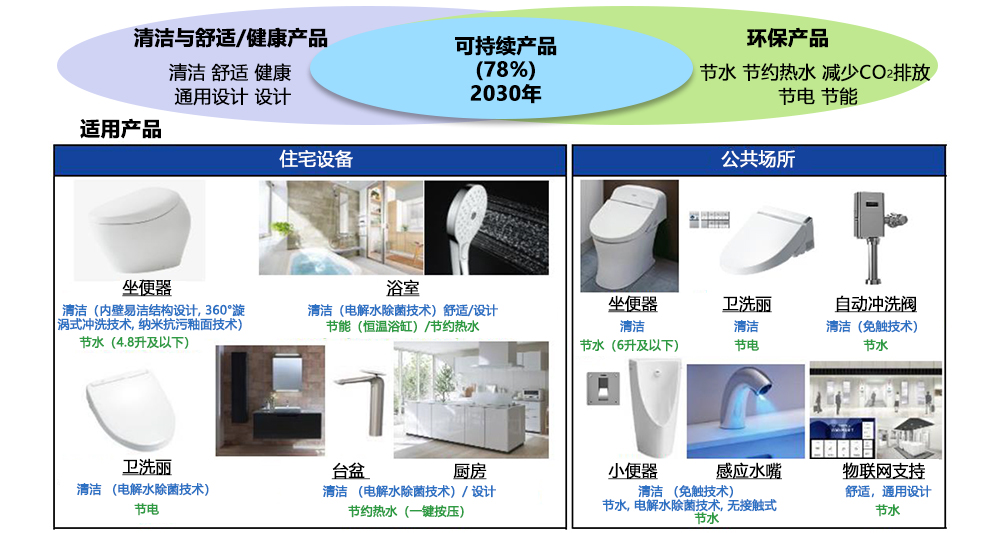 在新共享價值創(chuàng)造戰(zhàn)略——TOTO WILL 2030中,我們將TOTO的可持續(xù)產(chǎn)品定位為實現(xiàn)清潔與舒適以及保護(hù)環(huán)境的獨特TOTO產(chǎn)品。TOTO旨在2030年前,使可持續(xù)產(chǎn)品占其全球產(chǎn)品結(jié)構(gòu)的78%。通過推動這些產(chǎn)品的廣泛采用,TOTO將幫助建立一個豐富舒適的社會,對全球化環(huán)境有利。