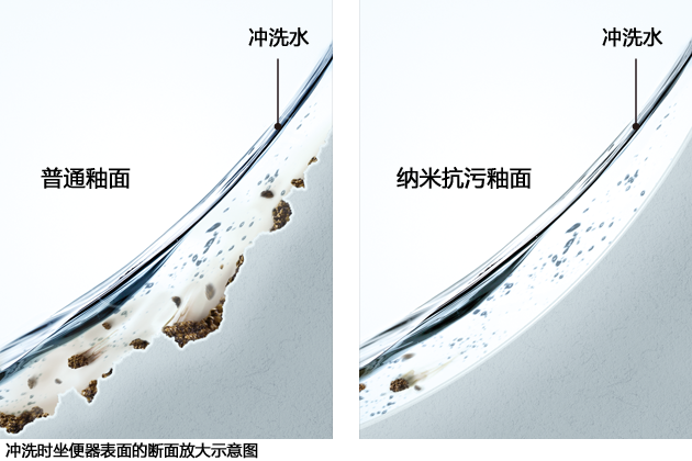 “智潔”,納米抗污釉面技術。超越納米尺度的超平滑表面,能減少陶瓷表面凹凸,讓污垢難以黏附,使得平日沖洗不必使用過多的清潔用水。清潔輕松的同時,還更加節水。