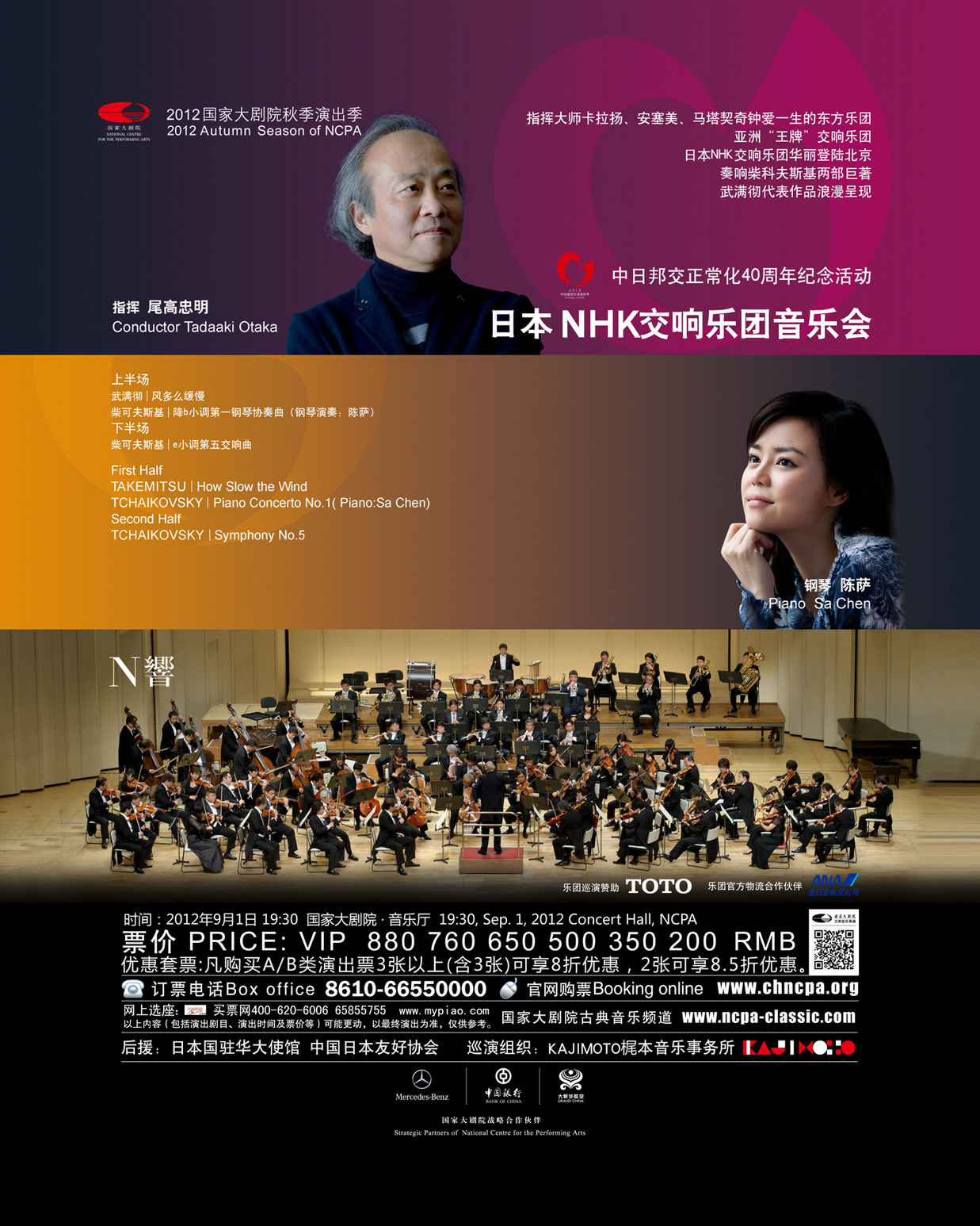 2012年是中日兩國邦交正常化 40 周年暨“中日國民交流友好年”。作為友好鄰邦,中日兩國在文化上的交流源遠流長,音樂活動更是層出不窮,兩國交響樂團的巡演對推進兩國的文化交流起了重要作用。9月1日、2日和4日,“中日邦交正?;?0周年紀念活動——日本NHK交響樂團音樂會”將在北京國家大劇院、天津大劇院及上海東方藝術中心隆重奏響。由著名指揮家尾高忠明率領的NHK交響樂團將與中國女鋼琴家陳薩合作,為這三座城市的觀眾們帶來一場震撼人心的交響音樂會。這也是NHK交響樂團距1998年首次訪華演出后,時隔14年的再度來訪。