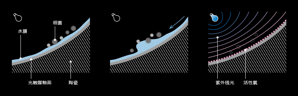 通過(guò)紫外線光照和釉藥產(chǎn)生光觸媒反應(yīng),由周?chē)难鯕夂退肿由苫钚匝酢;钚匝蹩梢杂行Х纸獠p少污垢、細(xì)菌的產(chǎn)生。